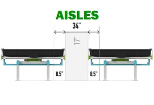 – Aisles: 8.5″ of travel from center provides a minimum aisle width of 17″.